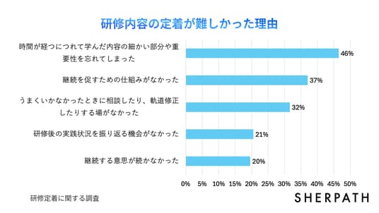 ・研修内容の定着における課題は「時間が経つにつれて学んだ内容の細かい部分や重要性を忘れてしまった」がもっとも多い