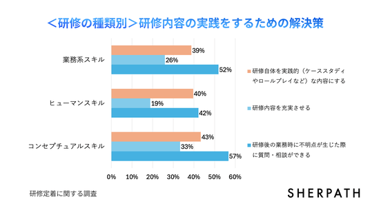 研修内容の定着をするための解決策としては、ヒューマンスキル・コンセプチュアルスキルで「定着を促すための仕組みをつくる」「実践状況を振り返る機会を設ける」が多く、継続的に実践を支援、促進する仕組みづくりづくりが重要だと感じている受講者が多いことがわかる。