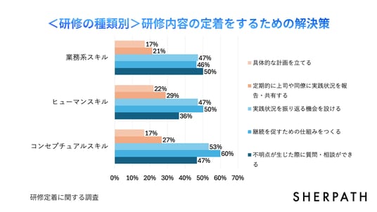 ・研修内容の定着は業務系スキルで「質問・相談ができること」、ヒューマンスキル・コンセプチュアルスキルで「定着の仕組みづくり」が鍵