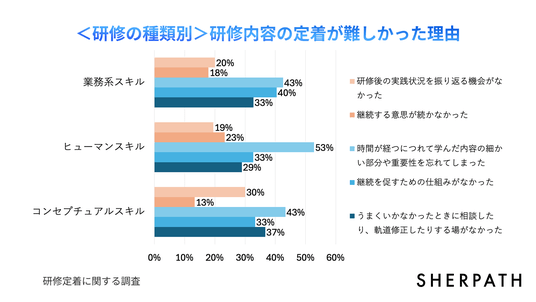 一方でコンセプチュアルスキルでは「研修後の実践状況を振り返る機会がなかった」「うまくいかなかったときに相談したり、軌道修正したりする場がなかった」と回答した人の割合が高く、振り返りの重要性が伺える。