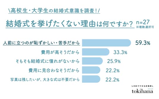 一方で、「結婚式を挙げたくない」理由のトップは「人前に立つのが恥ずかしい・苦手だから」(59.3%)で、次いで「費用が高そうだから」(33.3%)という結果に。