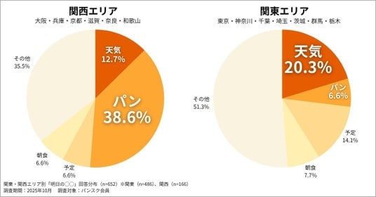 回答を地域別に見ると、関西エリア在住者のうち38.6%が「明日のパン」と回答し、一方で関東エリア在住者のうち20.3%が「明日の天気」と回答して最多となりました。特に大阪府と兵庫県では「明日のパン」と答えた割合が高く、“パン派”の傾向が際立つ結果となっています。