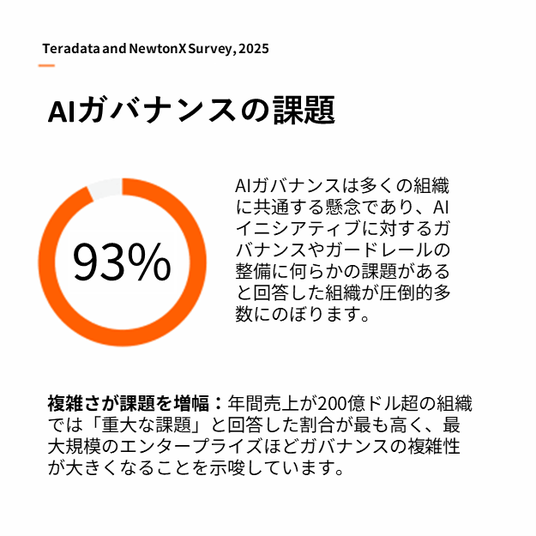 93%がAIガバナンスに課題を抱え、年商200億ドル超の企業では42%が「重大な課題」と回答。データの正確性(34%)がセキュリティ(32%)をわずかに上回り最大の懸念となっています。適切なデータを迅速かつ一貫して提供できると回答した企業は4%にとどまり、96%が遅延や不整合を経験。また、AIイニシアティブ推進に必要スキルをすでに保有している企業は13%のみで、社内教育や外部人材活用によるスキル獲得が急務となっています。