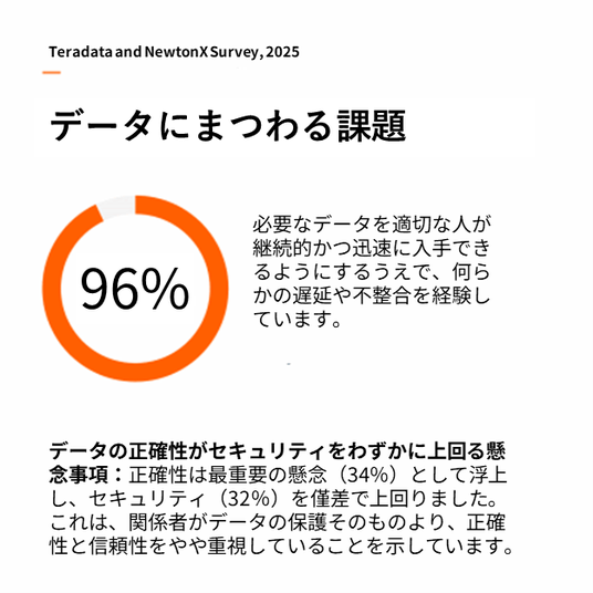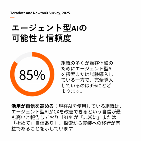 サンディエゴ発 |Teradata(NYSE: TDC)は、本日、C-suiteおよびAIリーダー500名超を対象に実施した最新調査の結果を発表します。本調査では、顧客体験(CX)向上を狙うエージェント型AIへの取り組み状況、ROI期待、運用上の障壁などを多角的に分析しています。多くの企業がエージェント型AIに期待を寄せる一方で、ガバナンスやデータ、スキル面の準備不足が顕在化していることが判明しました。