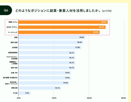副業・兼業人材の活用割合は、「情報システム(25.3%)」、「UI/UX・デザイン(24.7%)」、「マーケティング(23.0%)」が上位を占めました。いずれも変化が速く専門性が求められる分野であり、今回の結果は、不足スキルの補完にとどまらず、副業人材を通じて最新の知見や多様な発想を取り入れる動きが進んでいることを示しています。