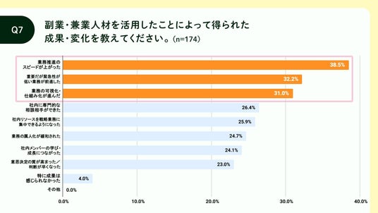 副業・兼業人材を活用して得られた成果を尋ねたところ、「業務推進のスピードアップ(38.5%)」が最多で、次いで「停滞していた重要業務の進展(32.2%)」、「業務の可視化・仕組み化(31.0%)」が挙がりました。全体の82.7%が「成果を実感した」と回答しており、副業活用が単なるリソース補完にとどまらず、組織にプラスの変化を生み出していることが明らかになりました。
