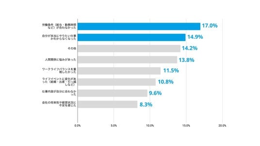 離職理由として最も多かったのは「労働条件(給与・勤務時間など)が合わなかった」(17.0%)、