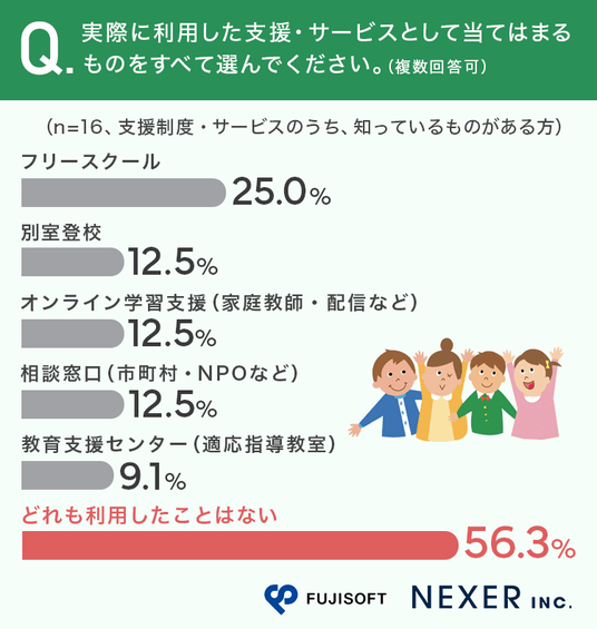 一方で、支援制度やサービスの利用率は低く、「どれも利用したことがない」と答えた方は56.3%にのぼり、認知や利用の課題が明らかになっています。