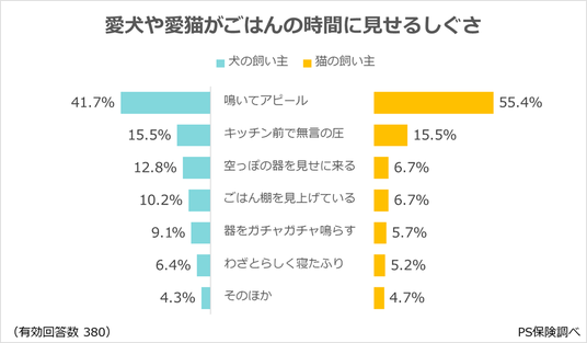 そのほか、「空っぽの器を見せに来る」(6.7%)や「器をガチャガチャ鳴らす」(5.7%)、「わざとらしく寝たふり」(5.2%)などは、いずれも少数派です。