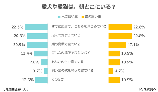・猫:「すでに起きて、こちらを見つめている」「足元で丸まっている」が同率で最多(22.8%)。ぬくもりの要請かと思いきや、熱視線。
