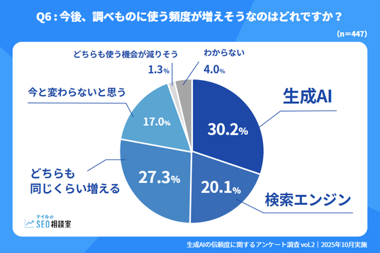 今後の利用頻度については、「生成AIが増えそう」と答えた人が30.2%と最も多く、「検索エンジン」(20.1%)を上回りました。