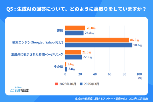 生成AIの回答を裏取りする方法として、「検索エンジン」(86.3%)が圧倒的多数を占め、前回調査(90.6%)とほぼ同水準を維持しています。