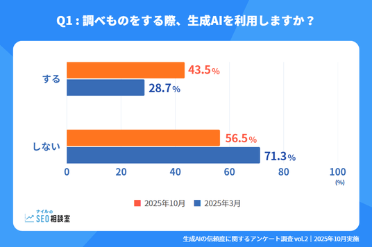 「調べものをする際に生成AIを利用する」と回答した人が前回の28.7%から43.5%へと半年程度で大きく増加しました。