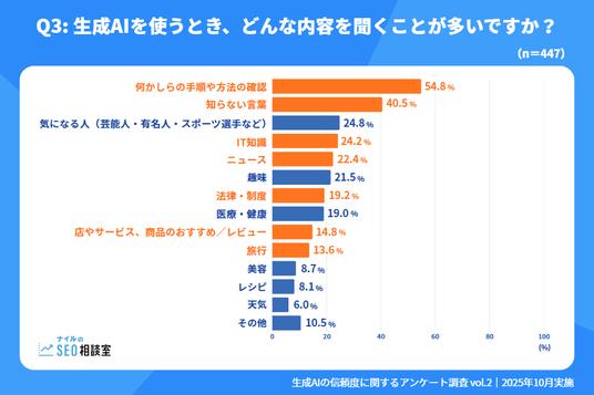 また、リアルタイム性が重要な「ニュース」(22.4%)、情報の正確性が一層求められる「IT知識」(24.2%)や「法律・制度」(19.2%)といった分野でも一定の利用が見られ、検索よりも要点整理が早いという特徴が、こうした領域で役立てられているのかもしれません。