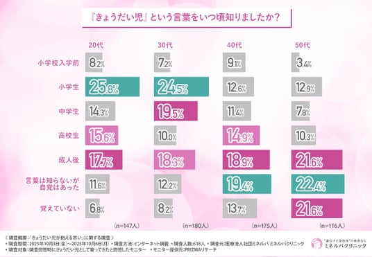 「きょうだい児」という言葉の認知時期は、20~30代では「小学校低・中・高学年」が中心だったのに対し、40~50代では「言葉は知らないが自覚はあった」の回答が最多となりました。