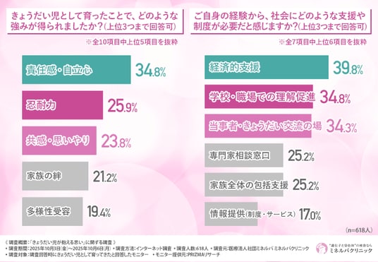 「きょうだい児として育ったことで、どのような強みが得られたか」について尋ねたところ、『責任感・自立心(34.8%)』『忍耐力(25.9%)』『共感・思いやり(23.8%)』が上位に挙がりました。