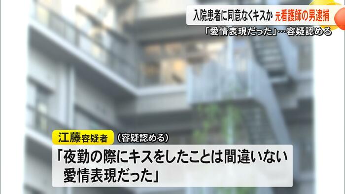 熊本・益城町の病院で、入院している20代の女性患者に同意なくキスをした疑いで、当時看護師として働いていた男(38)が逮捕された。男は容疑を認めていて、「愛情表現だった」と供述しているという。