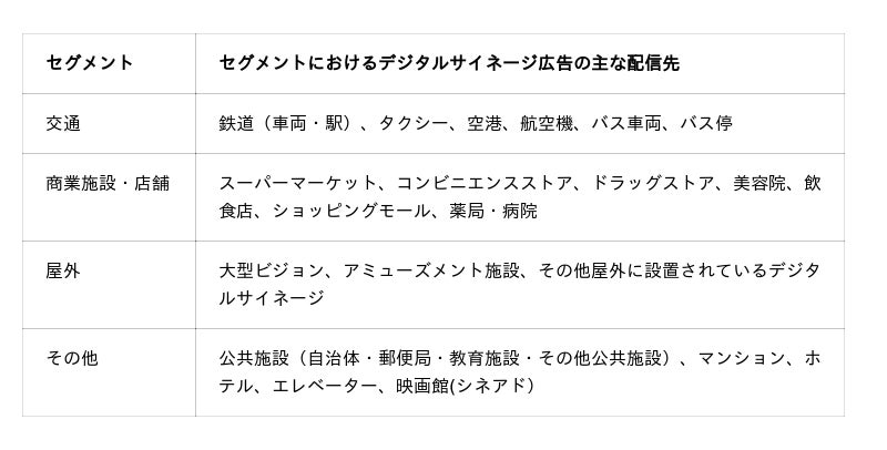 また、街中や店内などリアルな時間・場所で視聴者に接触し、臨場感のあるクリエイティブを届けられるデジタルサイネージ広告への需要も高まっており、市場の成長を後押ししています。