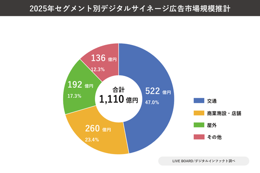 2025年のデジタルサイネージ広告市場規模は前年比116%、1,110億円と推測されます。交通は522億円で全体の47.0%、商業施設・店舗は260億円で全体の23.4%、屋外は192億円で全体の17.3%、そしてその他は136億円で全体の12.3%を占めると推測されます。