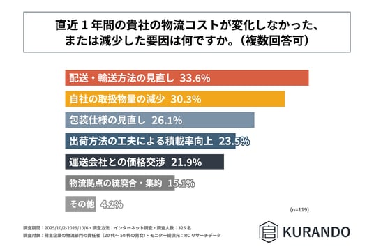 次に、直近1年間の自社の物流コストが変化しなかった、または減少した(変化はない、やや減少した、大幅に減少した)と回答した人を対象に「直近1年間の自社の物流コストが変化しなかった、または減少した要因」を尋ねる設問への回答では、1位が「配送・輸送方法の見直し」で33.6%、2位が「自社の取扱物量の減少」で30.3%、3位が「包装仕様の見直し」で26.1%という結果になりました。この結果から、直近1年間の自社の物流コストが変化しなかった、または減少した要因は主に「配送・輸送方法の見直し」や「自社の取扱物量の減少」であることがわかりました。