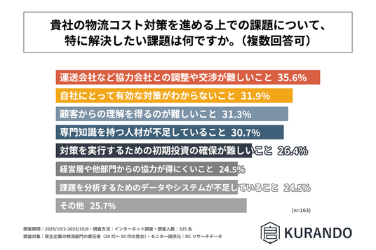 荷主企業の物流部門責任者の約半数が、現在自社の物流コスト対策は十分ではないと感じている!株式会社KURANDOが「物流コスト増加に対する荷主企業の対策に関する調査」を実施!