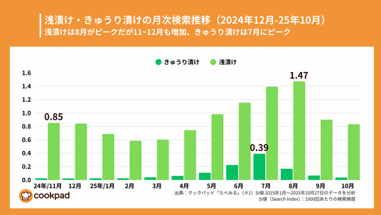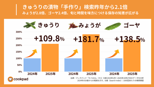 クックパッド株式会社は、10月30日の「食品ロス削減の日」(※1)に合わせて、家庭での漬物手作り検索動向を調査しました。漬物の市販価格が上昇する中(※2)、2024年から2025年にかけて「自分で漬ける」選択が急速に広がっており、きゅうりの漬物レシピ検索は前年比2.1倍、浅漬けは1.3倍に増加(※3)。ユーザーコメントの分析では「余った野菜の活用」が支持理由の一つとして挙がっており、「切って漬けるだけ、あとは時間が調理」という昔ながらの知恵が、物価高と食品ロス削減の両面で見直されています。