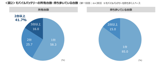 外出時に持ち歩く人が所有しているモバイルバッテリーの数は、「1台」が58.3%、「2台以上」が41.7%。外出時に持ち歩く台数は、「1台」が85.0%で、「2台以上」は少数派。<図2>