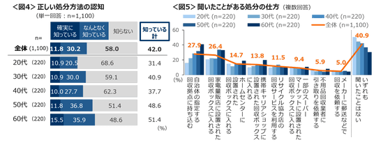 聞いたことがある処分の仕方は、「自治体の指定する回収拠点に持ち込む」が27.9%、「家電量販店に設置された回収ボックスに入れる」が26.4%と上位。