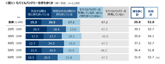 モバイルバッテリーを「所有している」人は52.8%で、外出時に「持ち歩く」人は35.8%。