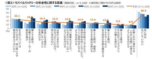 続いて、「信頼できるメーカーの製品を選ぶ」「高温になる場所に放置しない」「以前から安全には気をつけていたので、特に変化はない」「強い衝撃を与えたり、圧力をかけたりしないように気を付ける」が1割台後半。<図3>