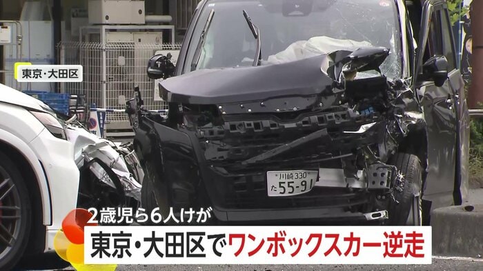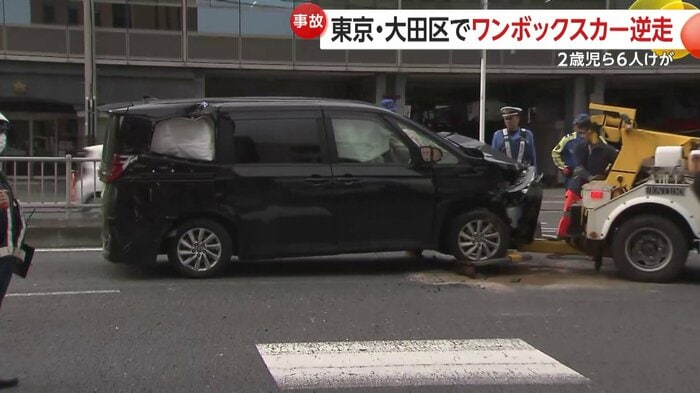 フロント部分が大破した状態で止まる黒のワンボックスカー。東京都内の大通りを逆走し車5台が絡む事故を起こした車両だ。
