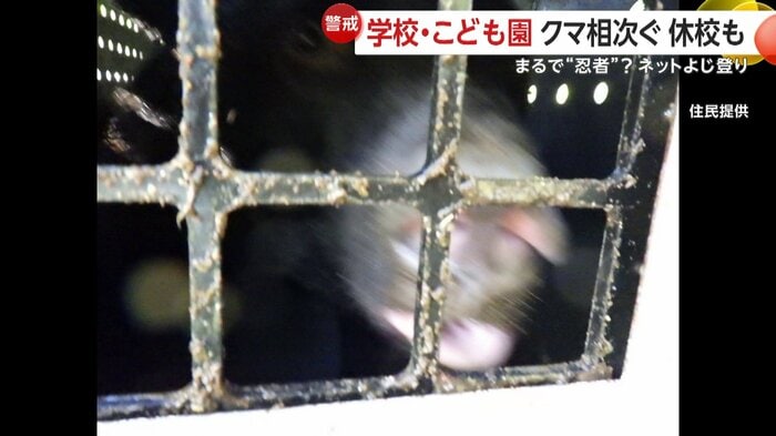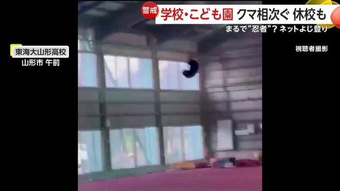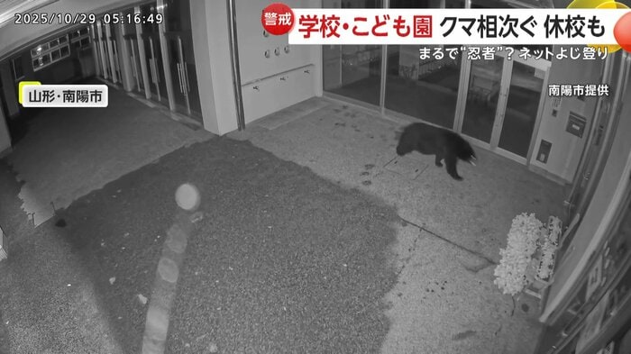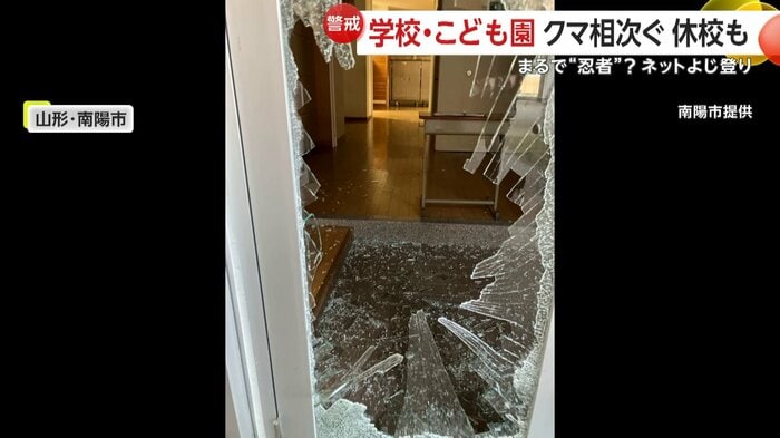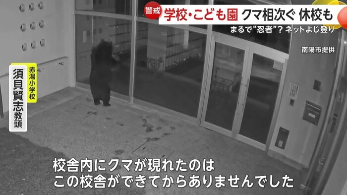 同じ山形県の南陽市にある小学校に設置された防犯カメラには、玄関の窓ガラスに体当たりするクマが写っていた。