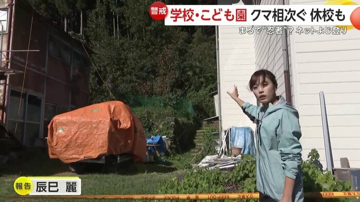 場所は、奥に見えるこども園のすぐ隣の敷地。今もクマが潜んでいると見て、厳戒態勢が続いています。