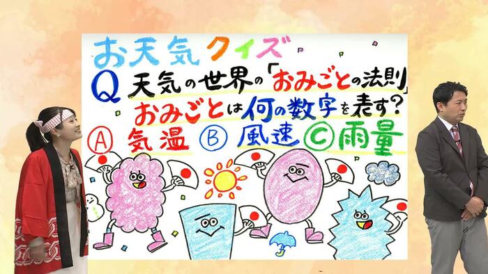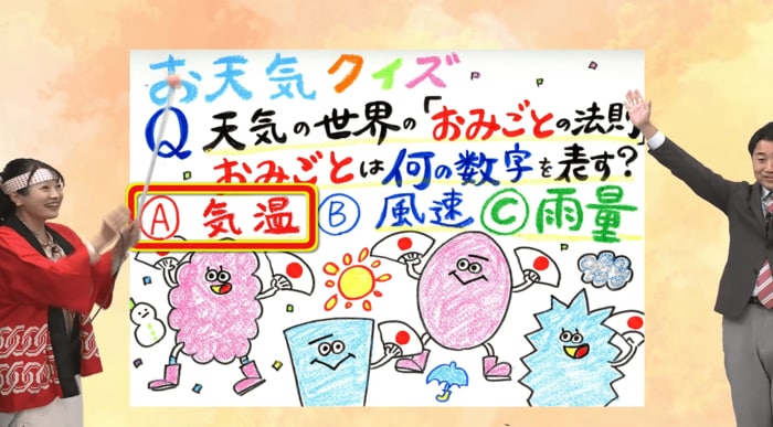 何の根拠もない回答でしたが、古山予報士からは、「お見事!正解です!」と弾んだ声が返ってきました。法被を着てきた甲斐がありましたね。正解はA:気温 とのことです。