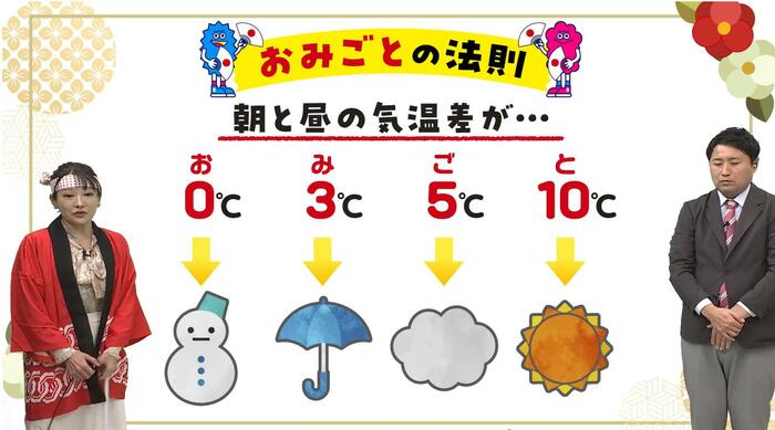 放送があった10月29日(水)は、日差しが届き、朝と日中の気温差は10.9℃。まさに「と」の10℃に近く、児玉アナも「晴れてました。『おみごとの“と”』ですね!」と納得です。一方で、雨の予報となっている10月31日(金)は、予想される気温差が3℃。これは「み」の3℃にぴったりです。
