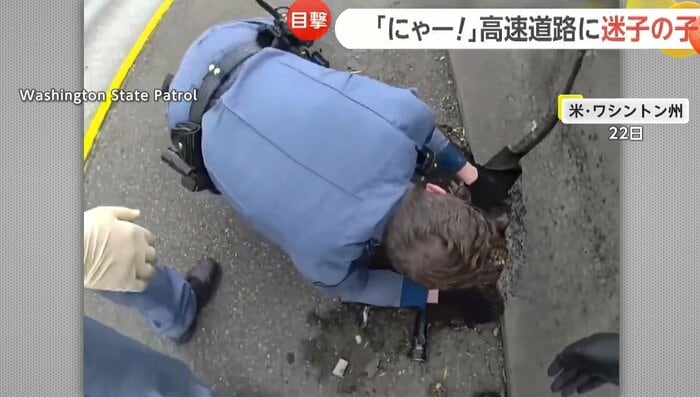 アメリカ・ワシントン州の高速道路で、警察官が中央分離帯の壁の隙間から子ネコを救出する様子がカメラにとらえられた。