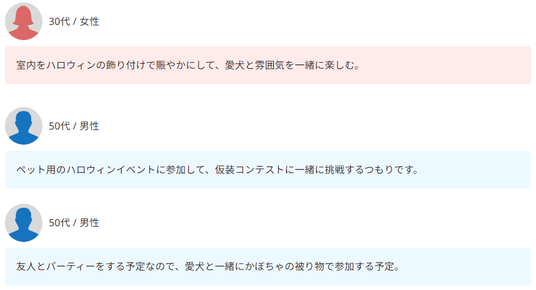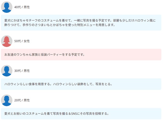- 愛犬にハロウィン仕様の衣装を着せる方が多い。手作りごはんや写真を撮るなど、手軽に楽しむ様子も見られた。