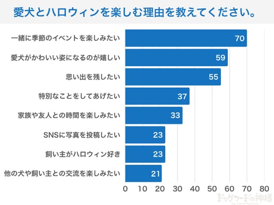 愛犬とハロウィンを楽しむ理由として最も多かったのは、「一緒に季節のイベントを楽しみたい」(70票)という回答です。