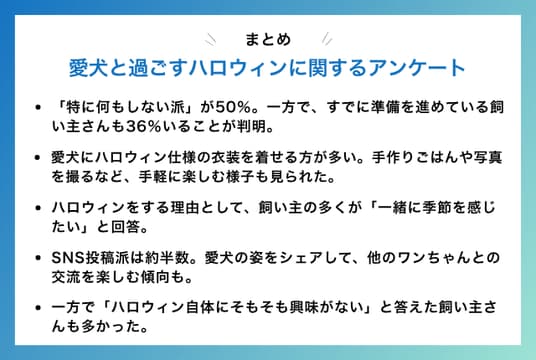 - ハロウィンをする理由として、飼い主の多くが「一緒に季節を感じたい」と回答。