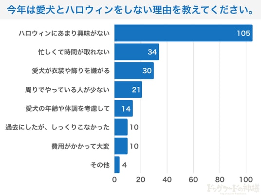 次いで多かったのは「忙しくて時間が取れない」(34票)、「愛犬が衣装や飾りを嫌がる」(30票)など、日常の事情や愛犬への配慮を挙げる声が挙がりました。