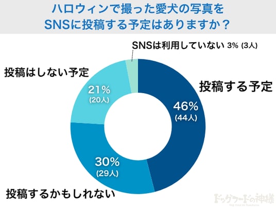 ハロウィンで撮った愛犬の写真を「SNSに投稿する予定」と答えた飼い主は46%(44人)と、ほぼ半数を占めました。