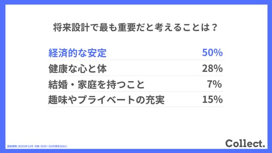Collect.(コレクト)では、20代~50代の男性を対象に、将来設計において最も重要だと考える要素について調査を実施。世代や収入によって価値観がどのように変化しているかを明らかにしました。