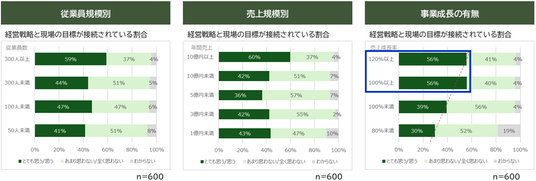 事業成長を実現している企業の5割以上が経営戦略と現場の目標が適切に接続されていることが判明しました。(従業員別、売上規模別では相関が見られず、事業成長の視点のみ正の相関が存在)