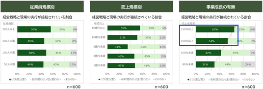 事業成長を実現している企業の6割以上が経営戦略と現場の実行が適切に接続されていることが判明しました。(従業員別、売上規模別では相関が見られず、事業成長の視点のみ正の相関が存在)