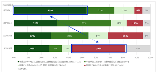 事業成長を実現している企業では5割以上が通期と半期で経営方針を言語化して全体に発信しているが、一方で、事業成長を見出だせていない企業では、経営方針の言語化自体を実施していない割合が高いことが判明しました。