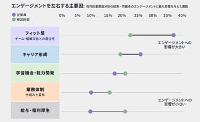 従業員エンゲージメントに最も影響を与えていた要因は、「フィット感(チーム・組織文化との適合性)」であると回答した従業員は37%を占めました。次いで「キャリア形成」支援に対する満足度が27%と、2番目に強い影響を持つ要因となっています。