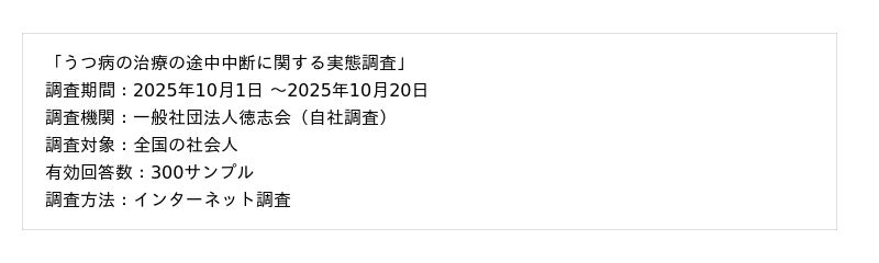 一般社団法人徳志会(所在地:東京都品川区、代表理事:河口雅弘)は、心療内科・精神科クリニックである新宿心療内科よりそいメタルクリニック(新宿駅東口徒歩3分)横浜心療内科よりそいメタルクリニック(横浜駅西口徒歩2分)柏心療内科よりそいメンタルクリニック(柏駅徒歩0分、2025年10月オープン)を運営し皆様のメンタルヘルスをサポートしております。今回はうつ病の薬の中断に関する調査を実施したので、その結果を紹介します。