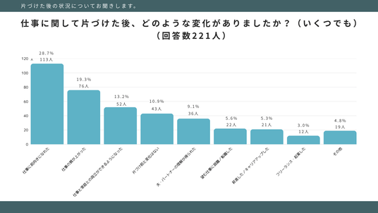 さらに、「仕事に前向きになれた」(28.7%)「仕事の質が上がった」(19.3%)といった回答も多く、家庭内の整理整頓が「生産性を上げる行為」であるという相関性が浮かび上がりました。