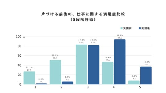 アンケート結果によると、家庭力アッププロジェクト(R)受講前は「時間の使い方に満足している(満足度4以上)」と回答した人が全体の14.9%にとどまりましたが、受講後は50.4%に上昇しました。