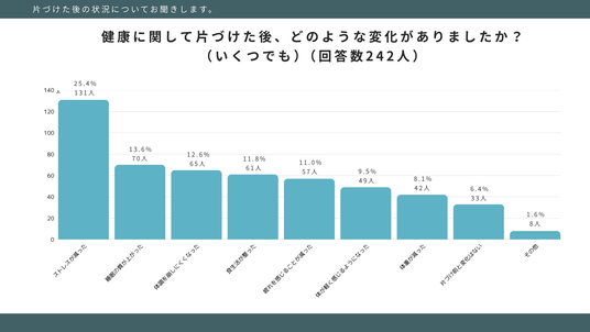 これらの結果から、家庭内の整理整頓が「環境ストレスの削減」「生活習慣の安定化」に繋がっていることが伺え、物理的な環境の変化が、メンタルヘルスの改善を後押しすることが明確に見て取れます。